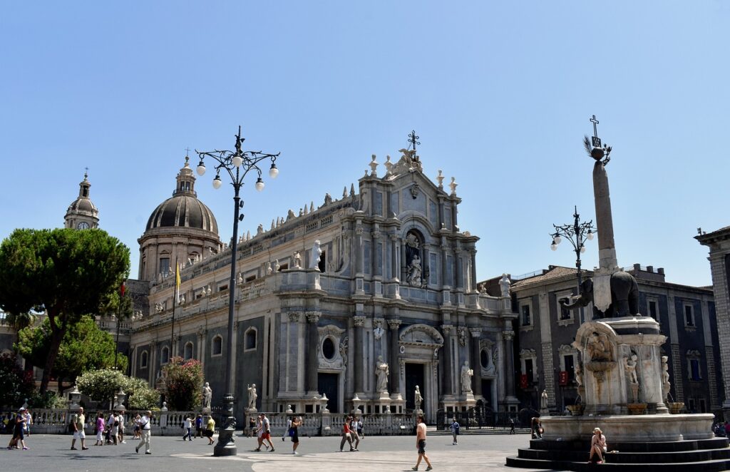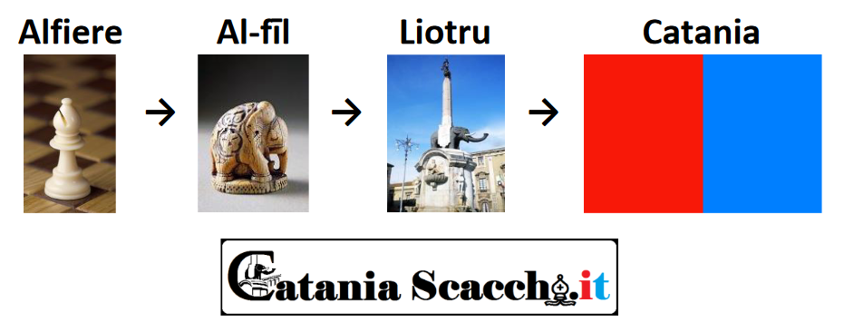 Una singolare coincidenza annoda a filo doppio la storia del nobil giuoco e quella della città di Catania… Chiunque si sia avvicinato al gioco degli scacchi si sarà chiesto cosa mai rappresenti l’alfiere, giacché per gli altri pezzi non occorre alcuna spiegazione (cos’è mai, ad esempio, un cavallo, se non un cavallo?). Ebbene, in origine gli scacchi si giocavano con pezzi che avevano ben altre forme e ben altri nomi, incarnando l’aspetto di figure tutt’affatto diverse da quelle a cui siamo abituati, senza contare che persino il loro movimento si differenziava da quello odierno, e proprio l’alfiere un tempo veniva chiamato “Al-fīl” (”L’Elefante”, in arabo). Ma l’elefante (ogni catanese lo sa) è anche il simbolo della città di Catania (che nel XII sec., sotto la dominazione araba, era appunto chiamata “Madīnat al-fīl” o “Città dell’elefante”). Così si spiega la compresenza del cosiddetto “Liotru” e di un alfiere stilizzato nel logo Cataniascacchi.it, realizzato — non a caso — impiegando il carattere tipografico denominato Elephant.